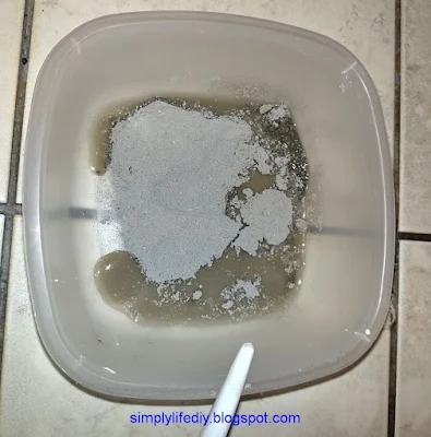 2. 調配好適量的水泥砂。五金行賣的水泥砂已調好比例,只要再加入適當的水混和即可。注意水要慢慢加,一次加太多容易太稀,那就要再增加更多水泥砂調和。注意,老一輩都說水泥"會咬手",避免不要用手直接接觸,若摸到要快以清水沖洗。最好找個廚房用防水手套來用就可以。水泥本身的酸鹼度PH值約10~12,算是強鹼喔!
